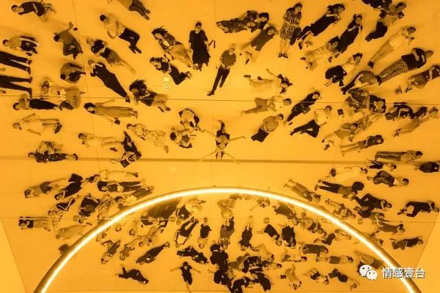 《形隐·不离》从《光》开始,表演场地是埃利亚松《道隐无名》作品的展厅。这件作品是埃利亚松特意为北京展览创作的。整个展厅散发着单频黄光,头顶是一个镜面,映射着地上的人。