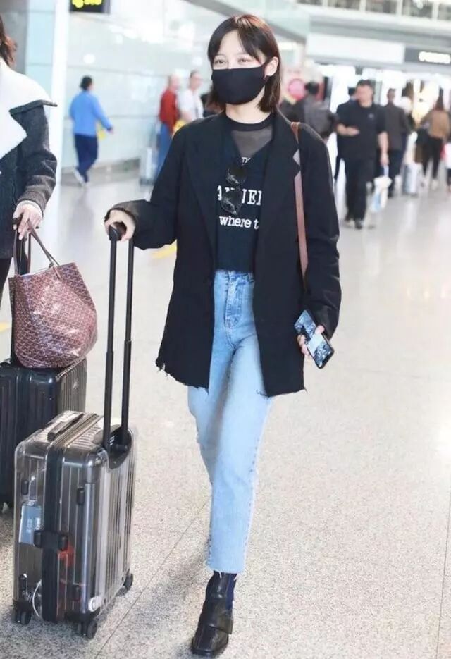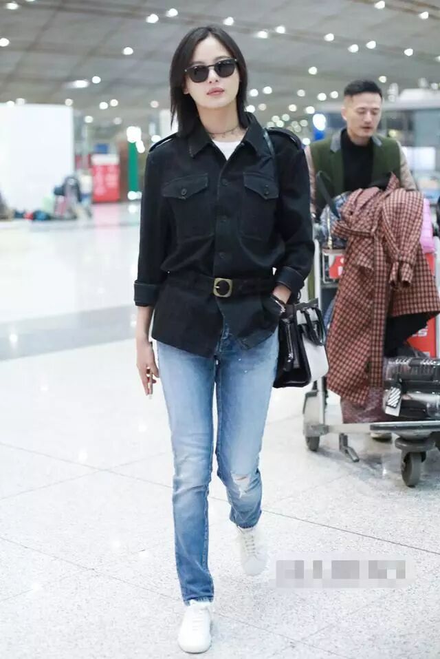 在机场身穿一件黑色的衬衣,腰间一个腰带显得不单调,下身一件浅蓝色破洞牛子裤,一个黑色的单肩包,脚上是一双白色休闲鞋,休闲系列的装扮却显得她干练十足,颇有女强人的气势。喜欢穿牛子裤的女生可以尝试黑色衬衣,不搭配白色也可以很好看。