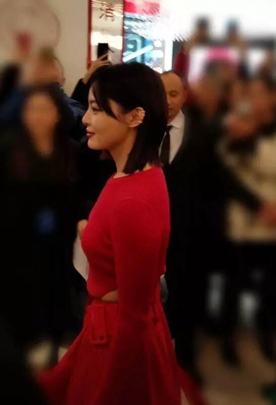 侧面看身姿也还是不错的,短发及肩比较减龄,裙摆下垂落落大方,上身较短,显得身材比例很好,但是腰间露肉的地方明显的被裙子勒出来一部分赘肉,与精修图的差别有点大,侧脸看着比正面有朦胧感。