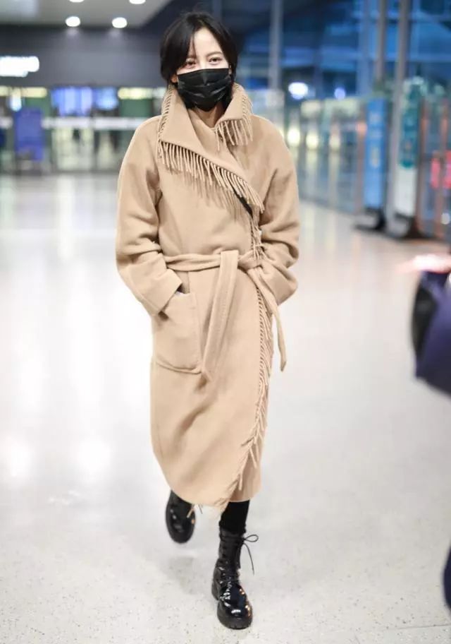 生活照中,上衣是一件驼色的高领大衣,但边上都有细碎的流苏,布满的时尚元素,腰间系一条腰带,可以拉开全身整体层次感,使腰身明显,看起来比例协调。脚上一双马丁鞋,很潮流,女生在穿大衣的时候,可以穿一双马丁鞋。