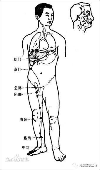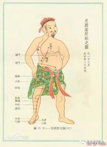 足厥阴肝经起于足大趾爪甲后丛毛处(大敦穴),沿足背内侧向上,经过内踝前1寸处(中封穴),上行小腿内侧(经过足太阴脾经的三阴交),至内踝上8寸处交出于足太阴脾经的后面,至膝内侧(曲泉穴)沿大腿内侧中线,进入阴毛中,环绕过生殖器,至小腹,夹胃两旁,属于肝脏,联络胆腑,向上通过横膈,分布于胁肋部,沿喉咙之后,向上进入鼻咽部,连接目系(眼球连系于脑的部位),向上经前额到达巅顶与督脉交会。