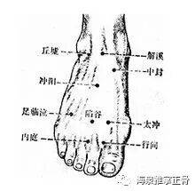【定位】:在足背侧,商丘与解溪连线之间,胫骨前肌腱的内侧凹陷处
