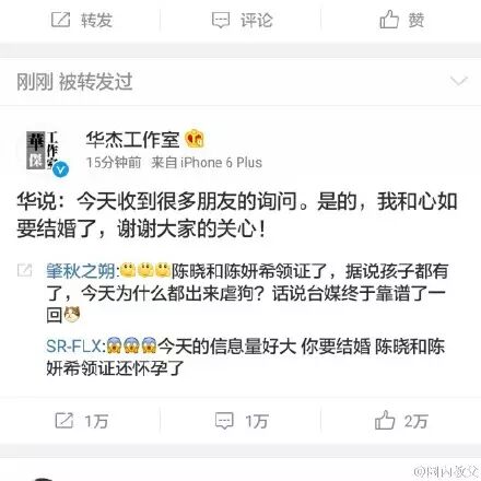 昨天的娱乐圈真是接二连三的喜讯,让人惊喜连连!先是从恋爱到求婚都甜蜜高调的陈晓和陈妍希,昨日终于在男方的老家合肥领取结婚证啦!更宣布从此两人变“仨人”。
