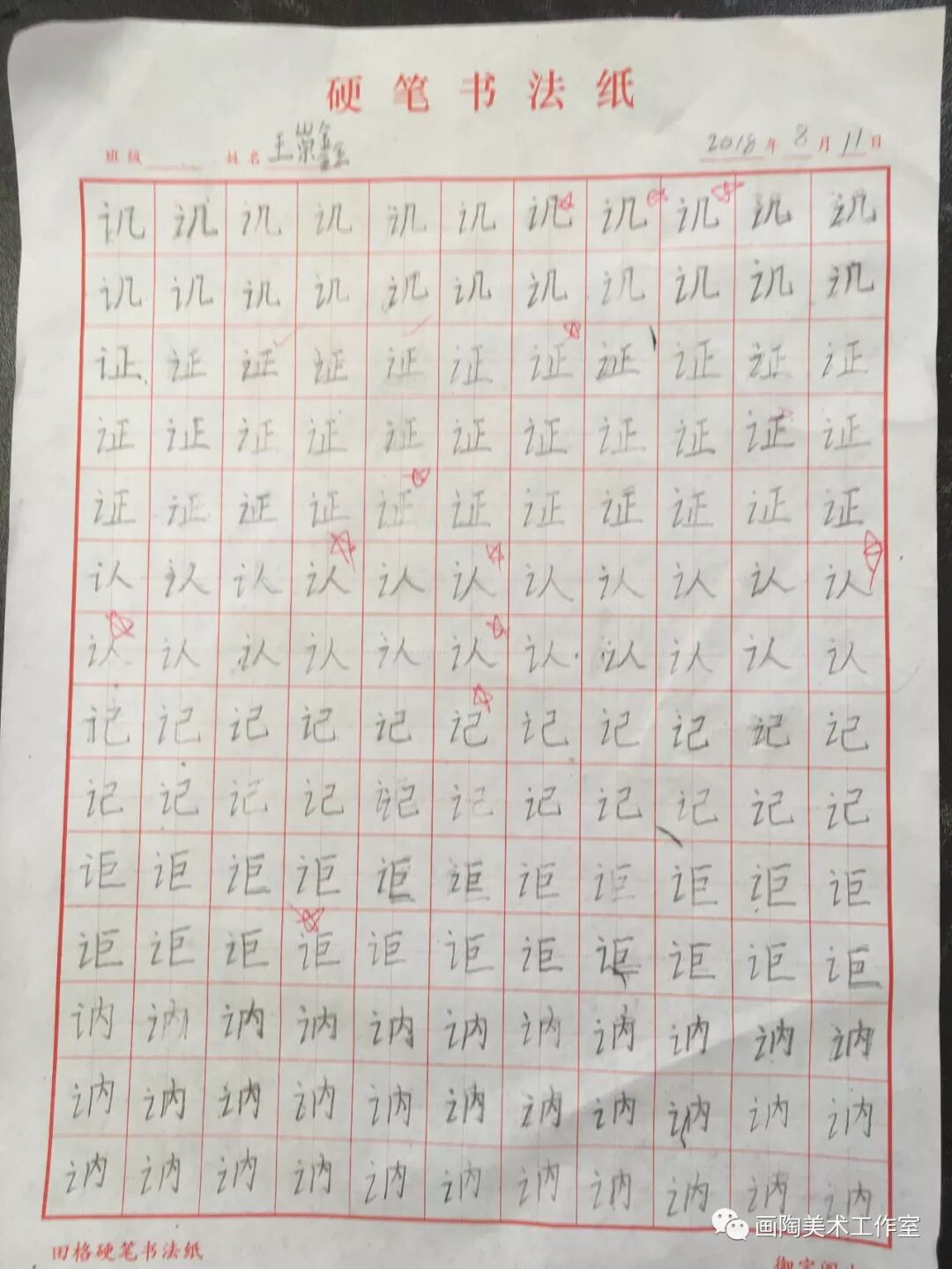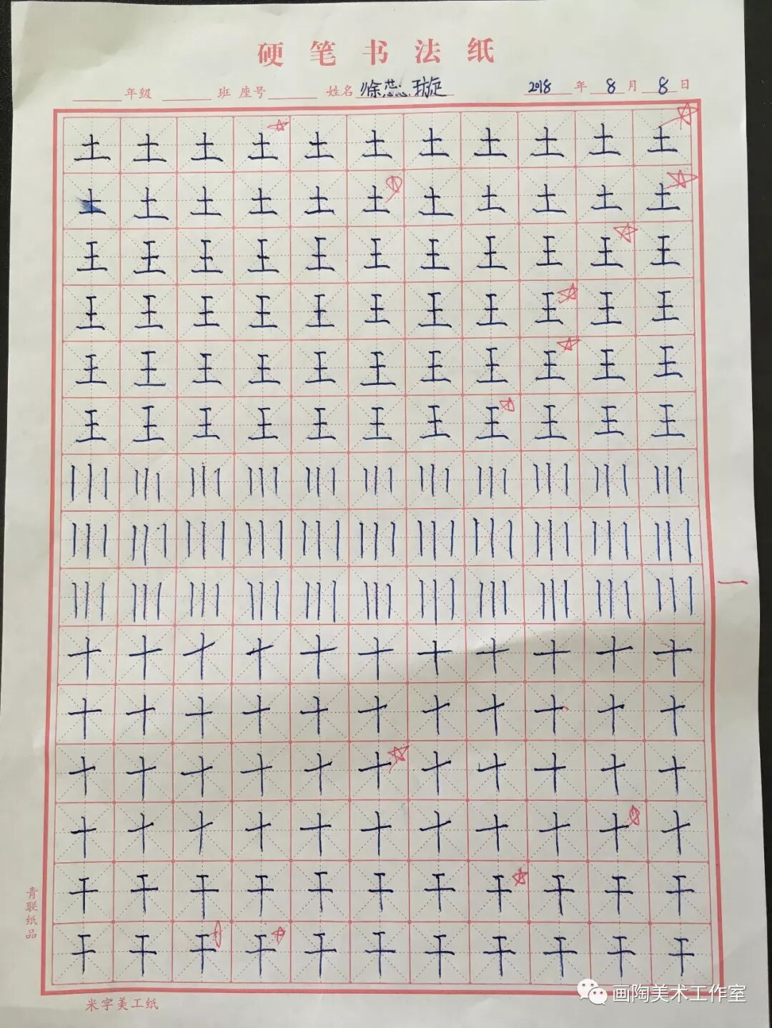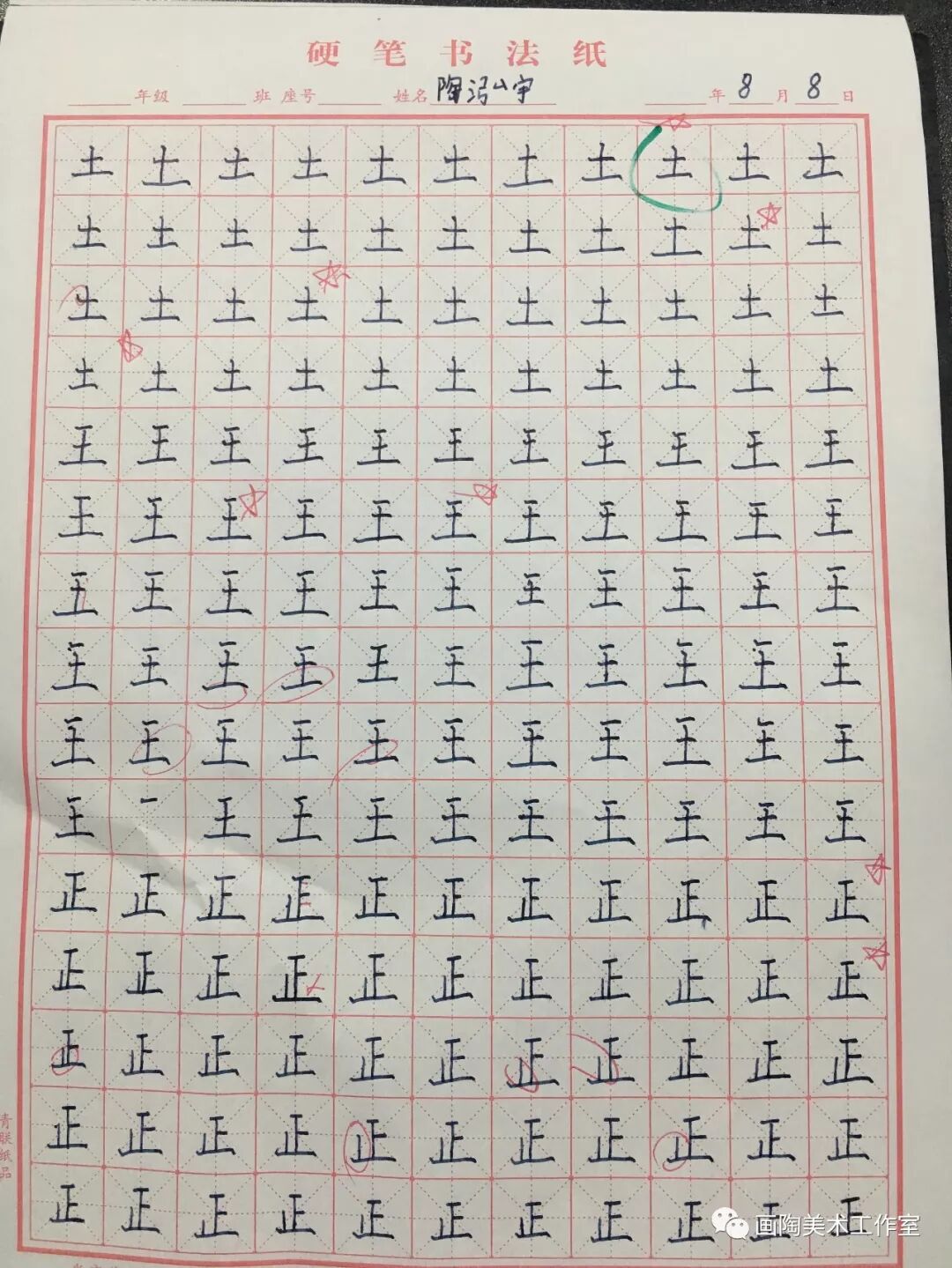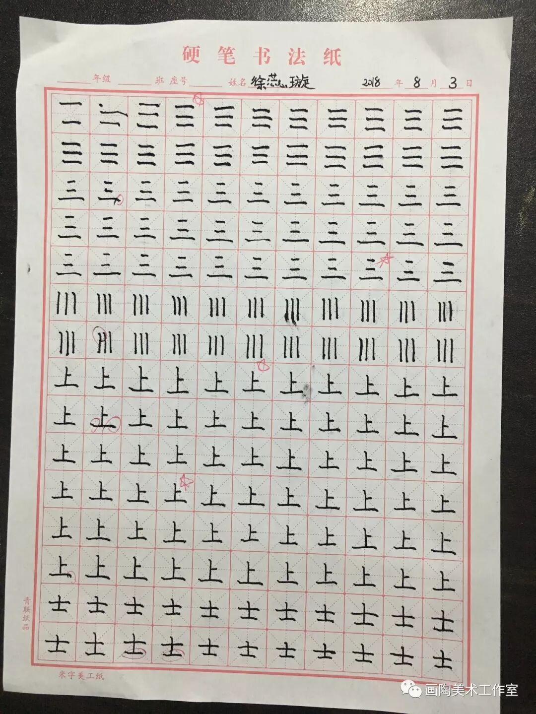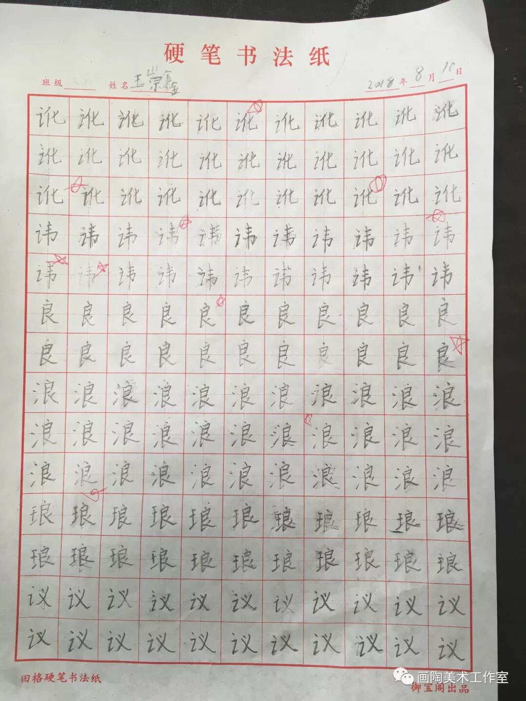 王睿刚起步,手抖得很厉害,但是男孩子中我很看好他,第二节课已经能悟出笔画的方法,多写写会好。