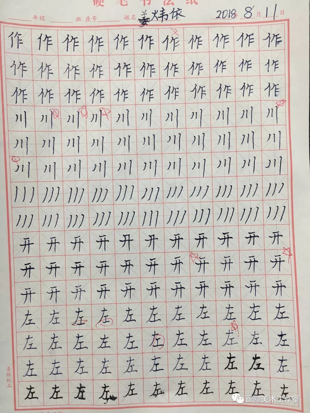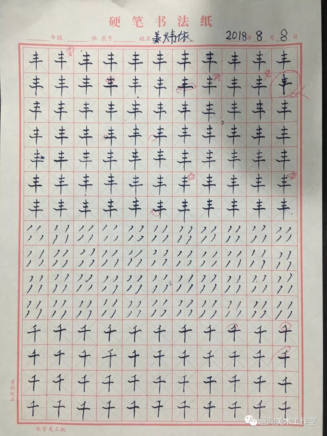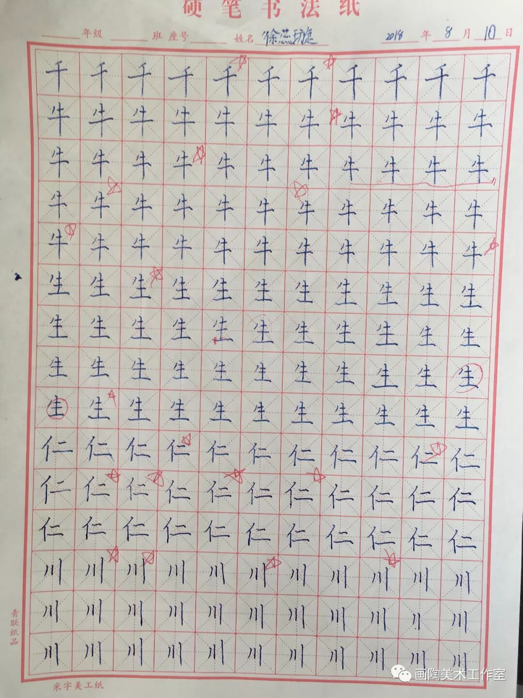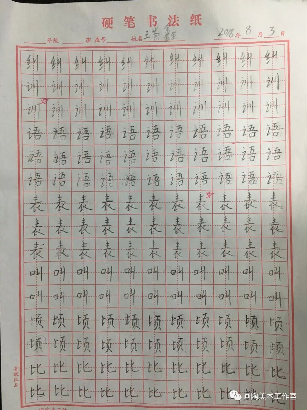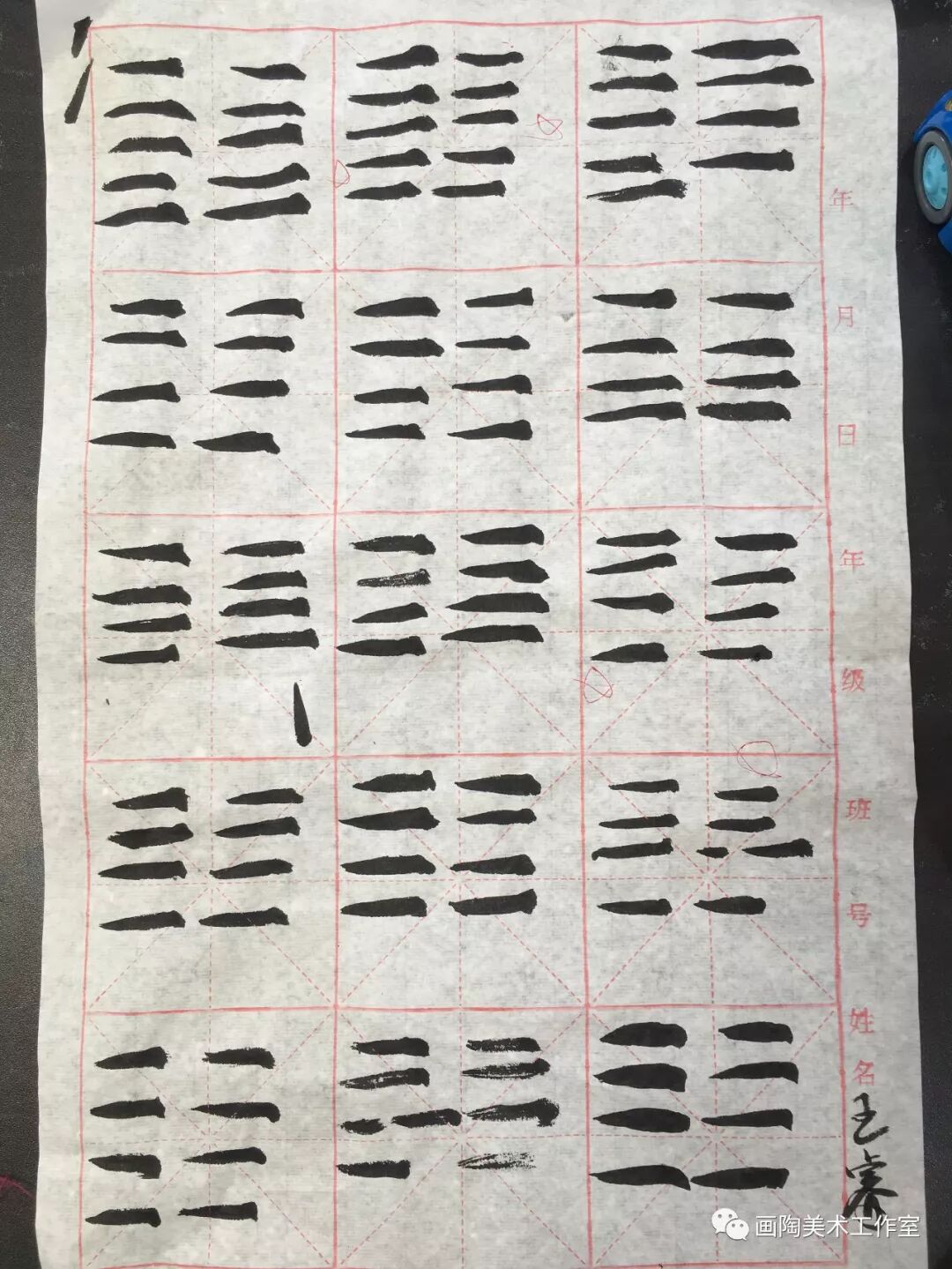 王睿刚起步,手抖得很厉害,但是男孩子中我很看好他,第二节课已经能悟出笔画的方法,多写写会好。