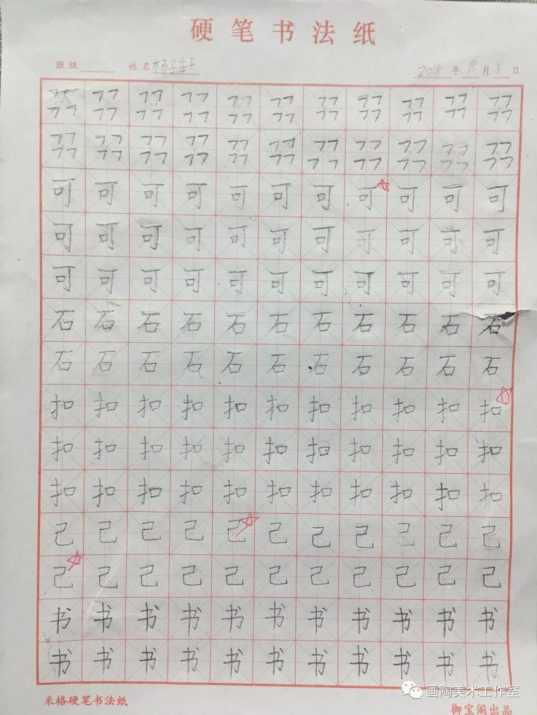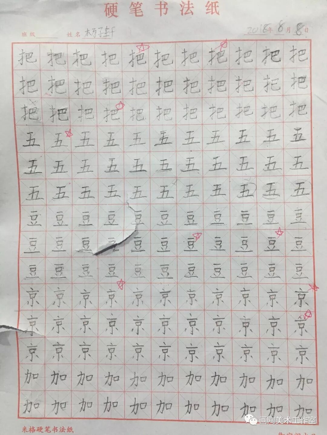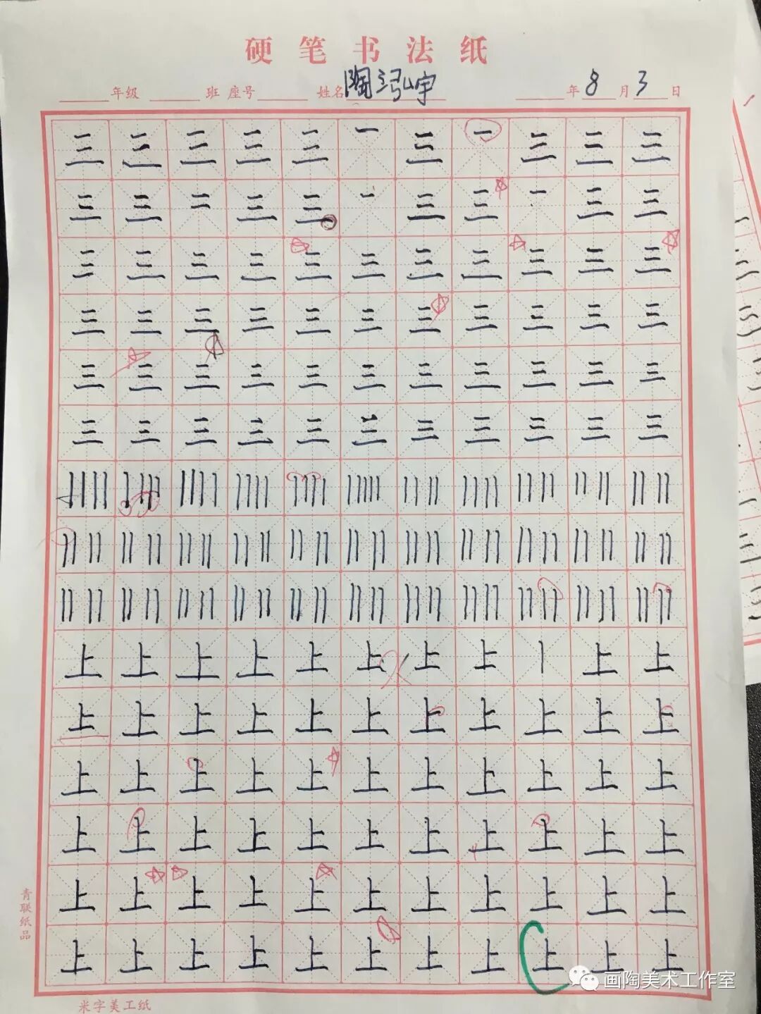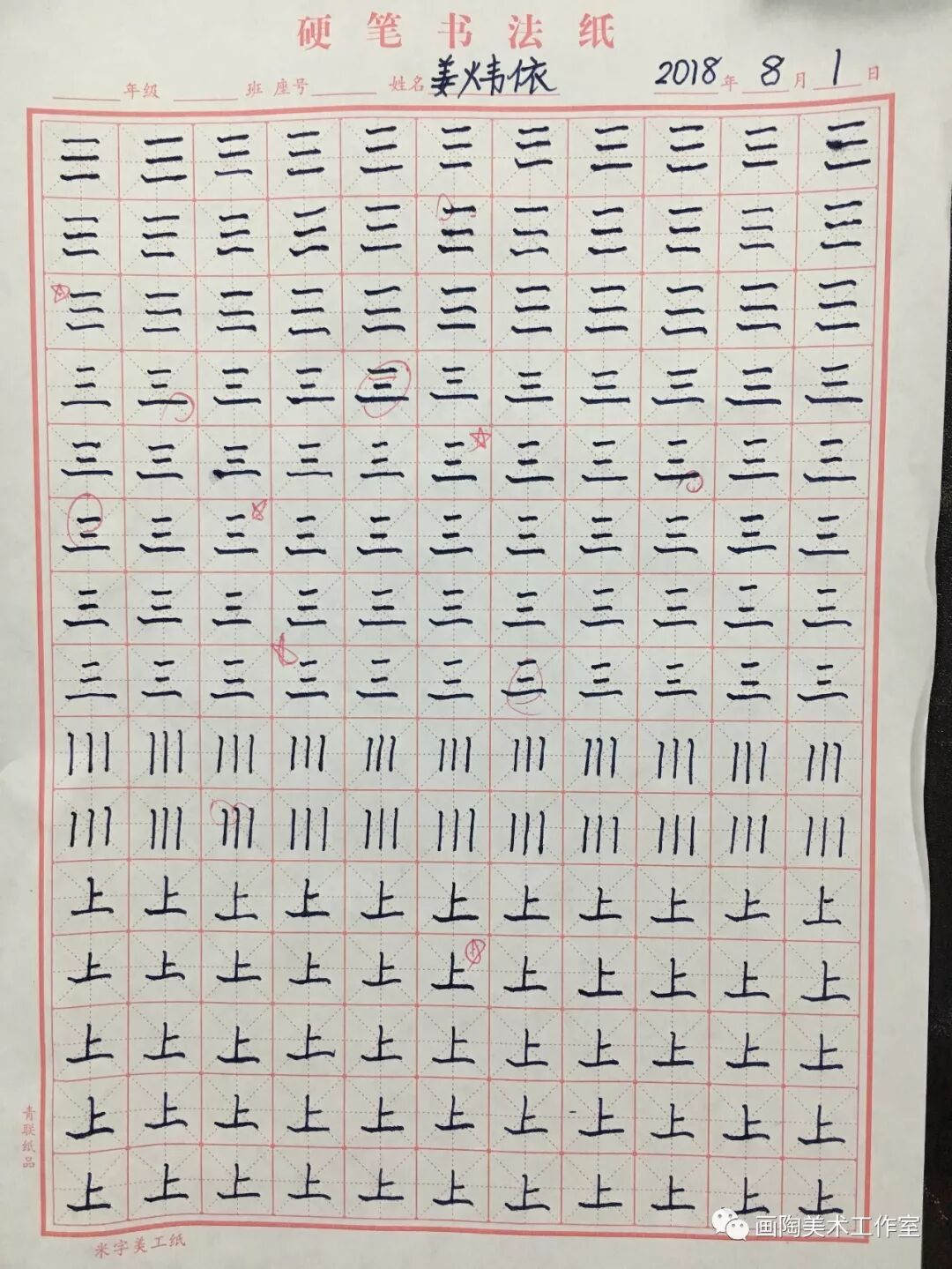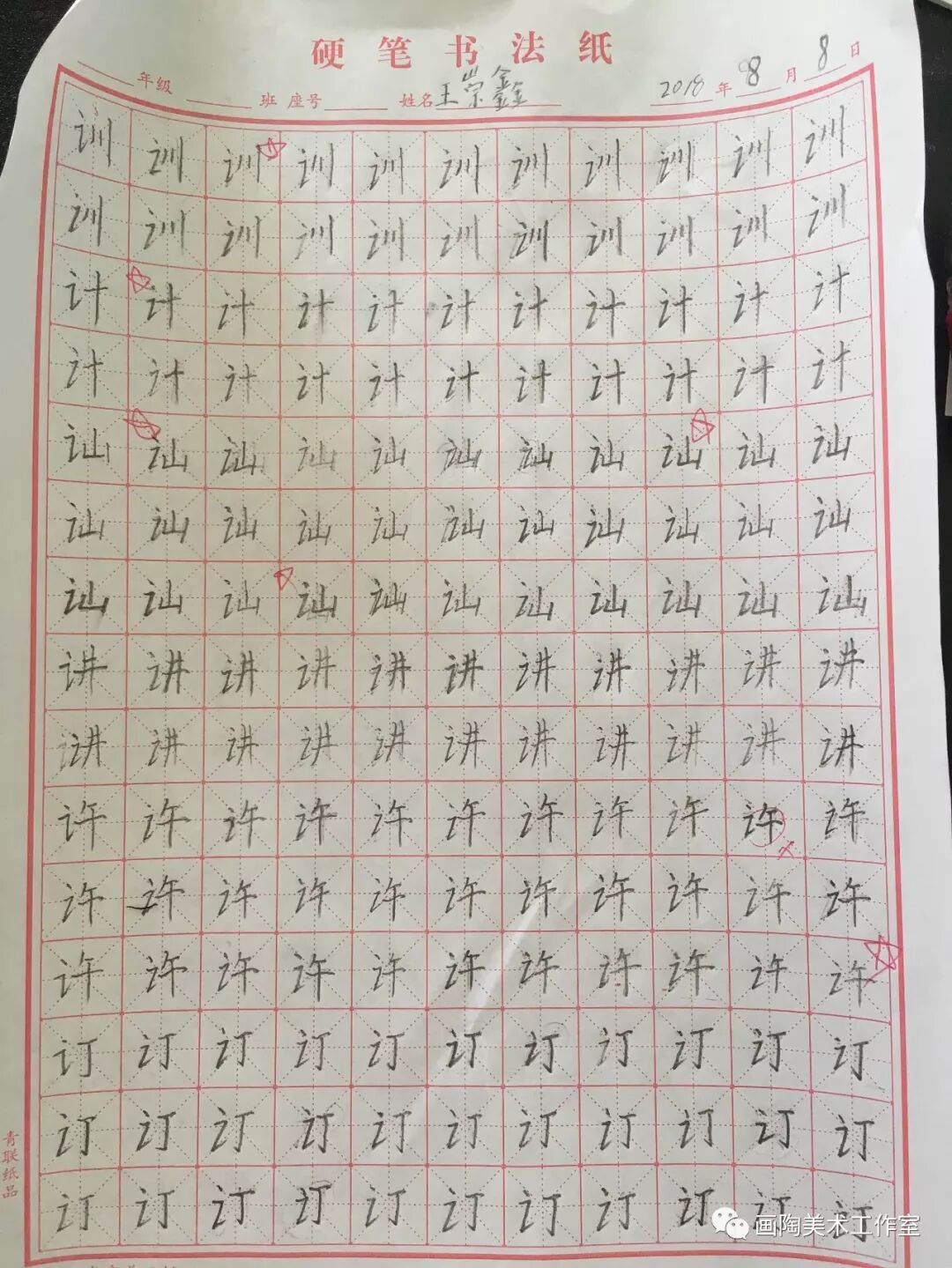 王睿刚起步,手抖得很厉害,但是男孩子中我很看好他,第二节课已经能悟出笔画的方法,多写写会好。