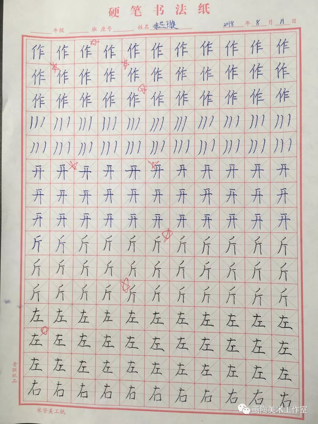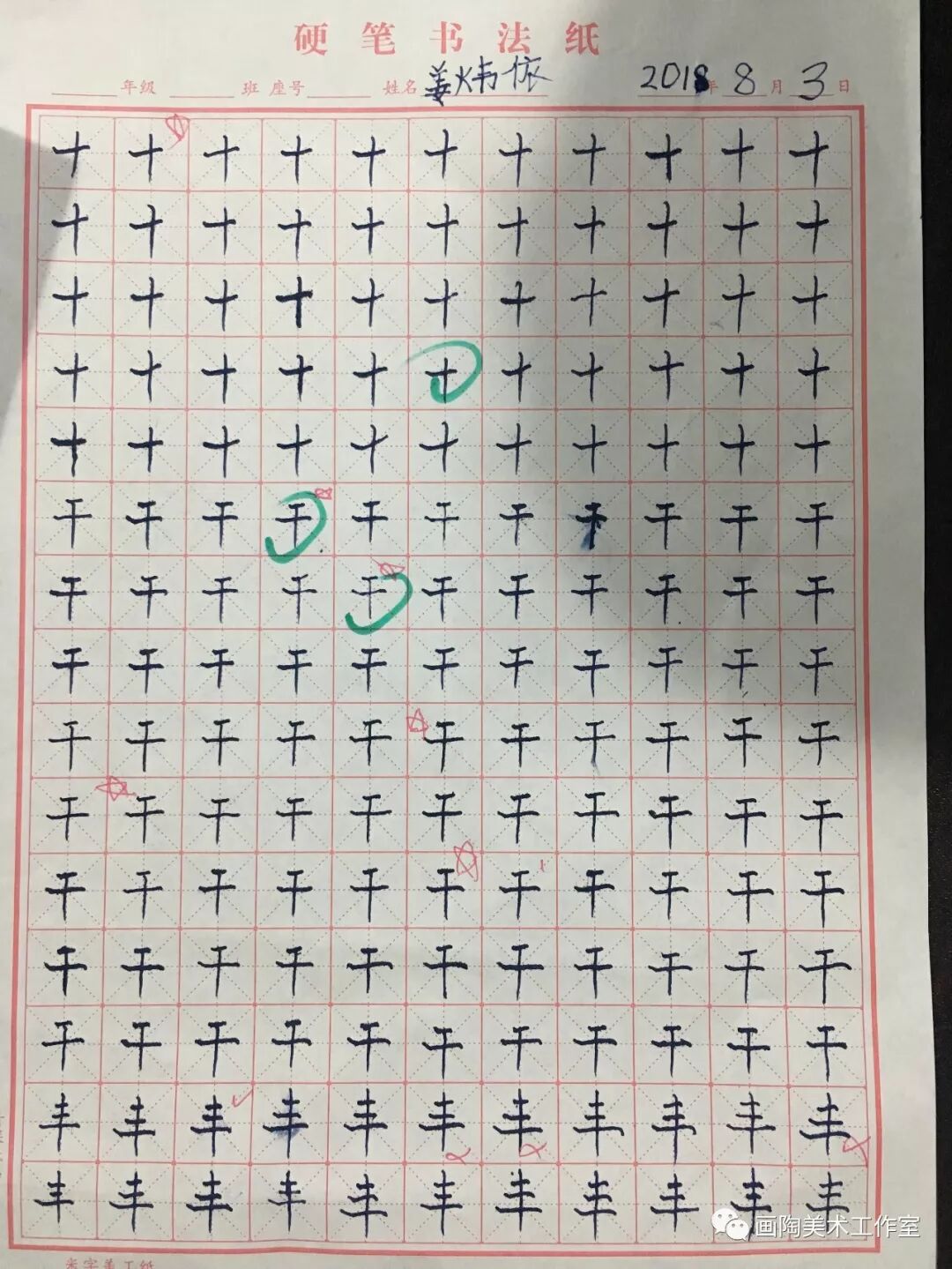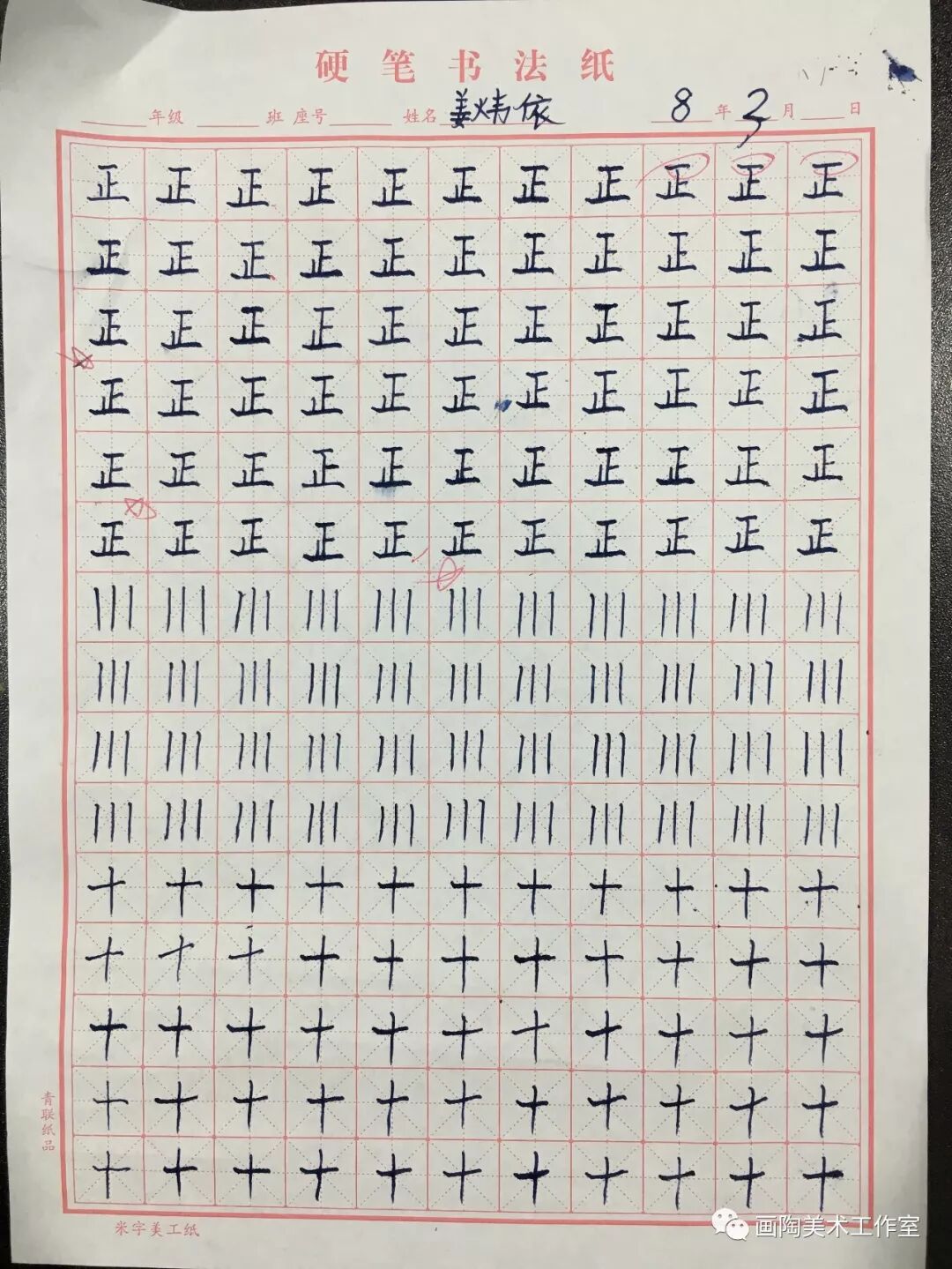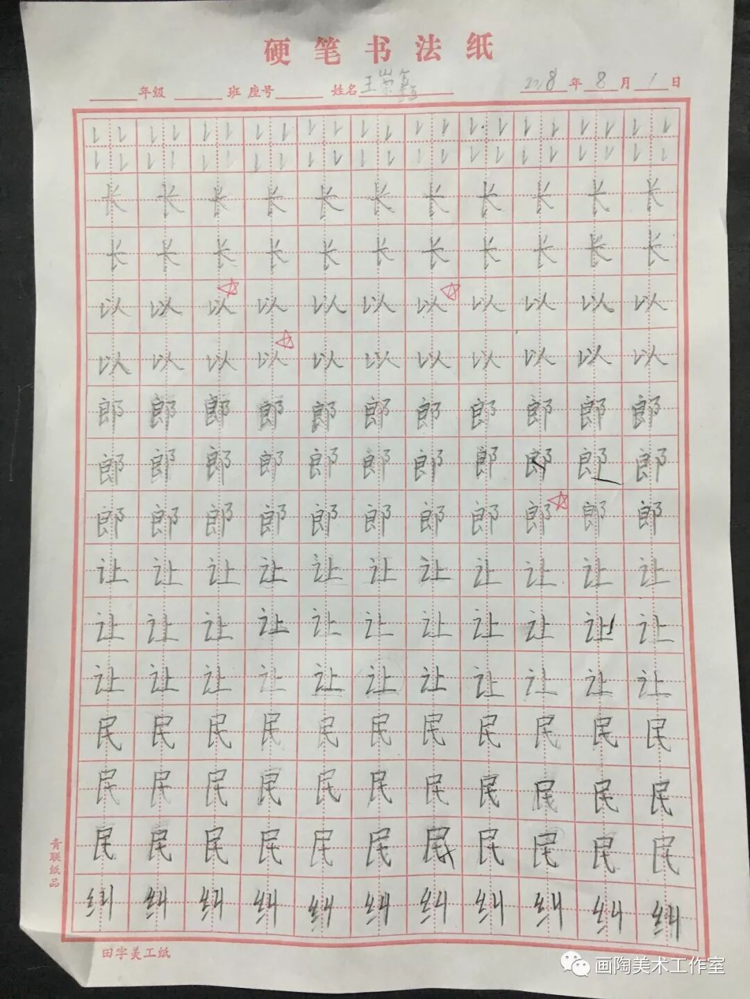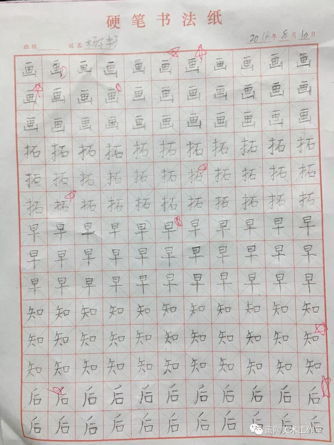 王睿刚起步,手抖得很厉害,但是男孩子中我很看好他,第二节课已经能悟出笔画的方法,多写写会好。
