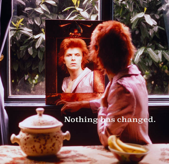 把这套精选集的时间顺序倒过来,也是Bowie的典型做派。“一切不变”,这题名竟来自“摇滚变色龙”的精选集,我们不如顺着这套曲目,坐上时光穿梭机,以倒叙的方式,回头观望他这前无古人后无来者的“风格多变”又“本性未变”的五十年音乐生涯。