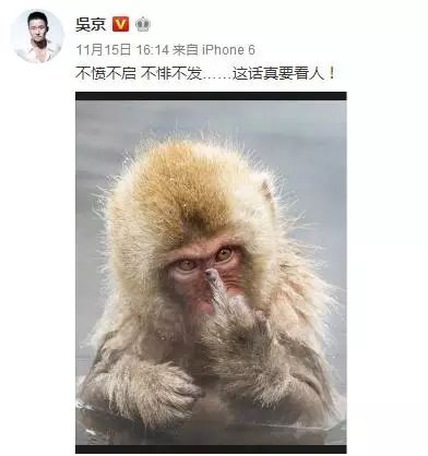 吴京昨天发微博:不愤不启,不悱不发.....这话真是要看人!这微博还配图了一个猴子,而且是竖起中指的样子,要知道张翰就是叫娜扎小猴子,这难道是在骂两个人,真是一箭双雕啊!