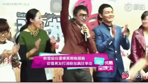 韩雪在一次公开活动上被一赤裸着上身的男子强行抱住,吓得她连连后退。
