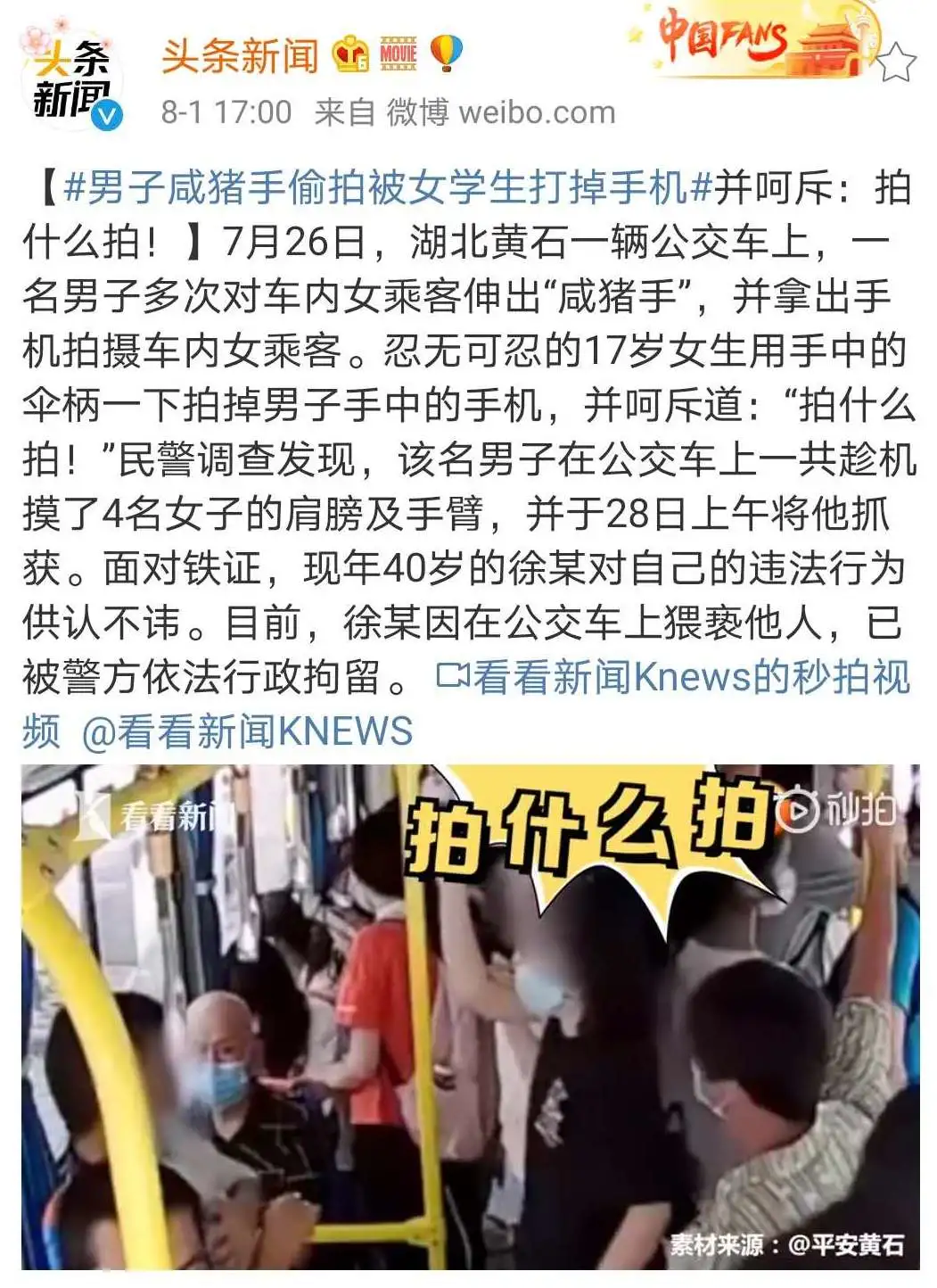 一个男子在公交车上对女乘客屡次伸出咸猪手,还拿出手机偷拍。