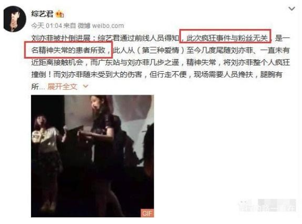 刘亦菲在某电影发布会现场,被一名男观众冲至台上,疯狂地扑倒,导致刘亦菲身上出现多处摔伤淤青。