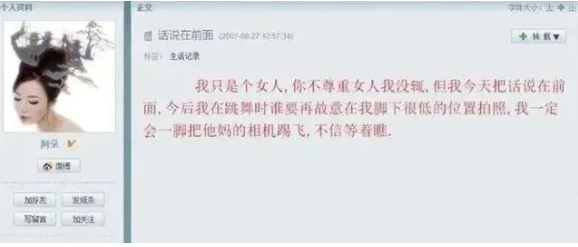 但今后我在跳舞时,谁要在故意在我脚下很低的位置拍照,我一定会一脚把相机踢飞,不信等着瞧!