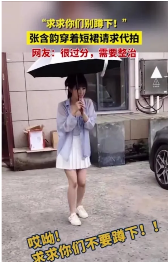 当日,张含韵衣着短裙撑伞出工时,遭到了一群代拍的低角镜头轰炸。