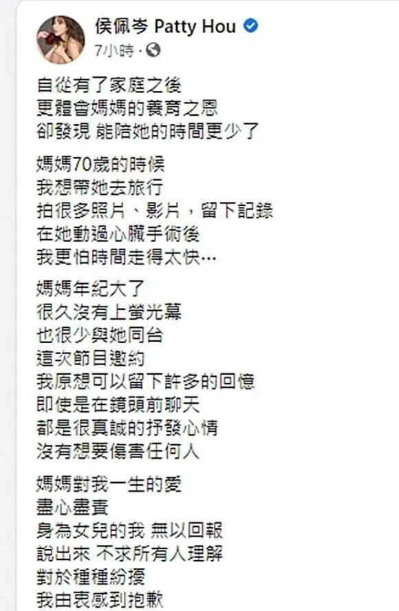 而侯佩岑发文力挺母亲:“只是很真诚地抒发心情,没有想要伤害任何人。”