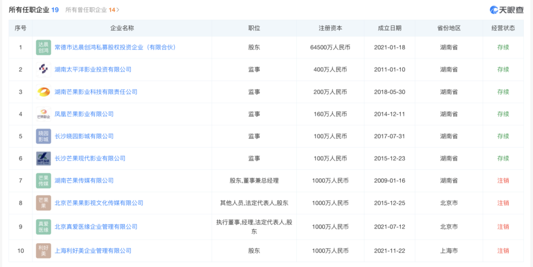 天眼查显示,李湘关联企业有19家,其中6家为存续状态,包括常德市达晨创鸿私募股权投资企业(有限合伙)、湖南太平洋影业投资有限公司、湖南芒果影业科技有限责任公司、凤凰芒果影业有限公司等,版图涉及投资、影业。在上述企业中,李湘直接持有1家企业股份,并在5家影业、影城相关企业中担任监事职务。