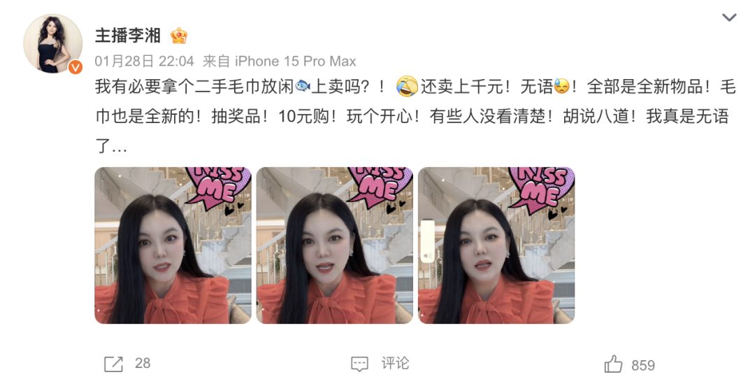 当日晚间,李湘发微博回应网传在二手平台1560元出售二手毛巾。她表示:“我有必要拿个二手毛巾卖吗?!还卖上千元!无语!全部是全新物品!毛巾也是全新的!抽奖品!10元购!玩个开心!有些人没看清楚!胡说八道!我真是无语了……”
