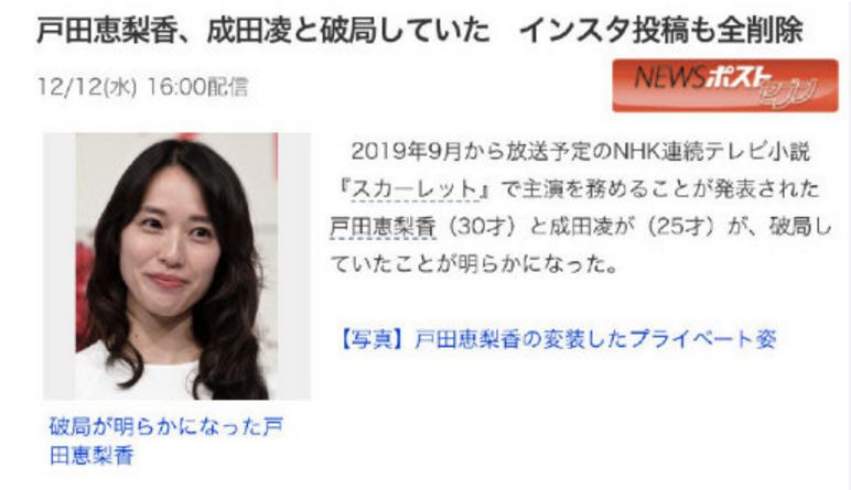 不过,近日日本媒体被曝光了他们已经分手的消息。10月份的时候两人突然都把Instagram的投稿清空了,据最新一期《周刊现代》推测两人就是在那时已经分手。