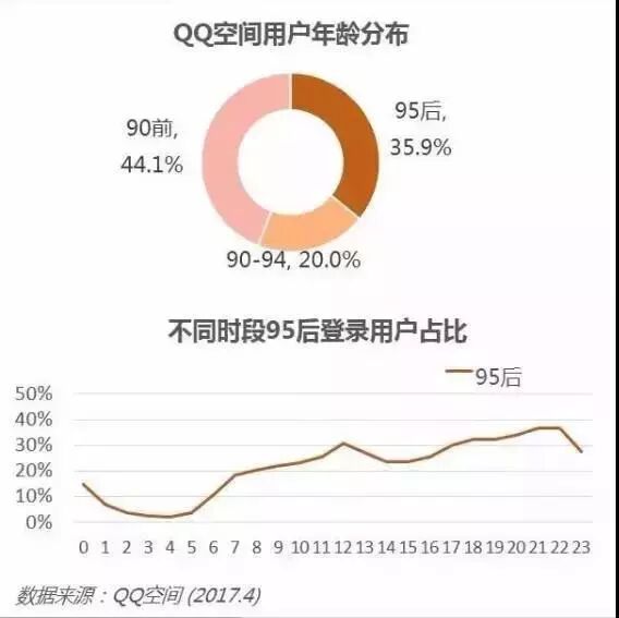 中国互联网络信息中心2017年报告显示,29岁以下网民占全部网民的52.2%。用户年轻化是大部分互联网产品的新趋势,来自QQ空间今年4月的数据显示,QQ空间用户年龄分布中,95后占据了35.9%,出生于1990年-1994年的占据了20.0%,1990年以前的用户占据44.1%。