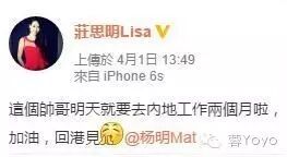 其实,今年四月初,两人在微博的合照已透露蛛丝马迹。照片是两人在餐厅中的自拍,脸贴脸。之后庒思明更留言传情,指杨明将到内地工作,要两个月后才能相见。