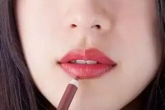 2、将唇线画得超过上唇一些,注意要选择比上色唇膏顏色浅的唇线笔。