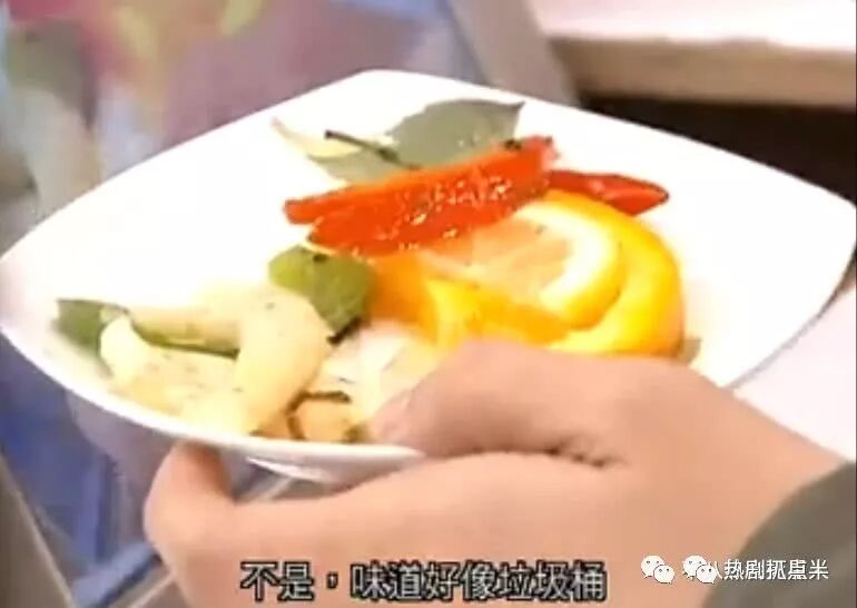 第二回合做的墨鱼,把鱿鱼豉椒放在一起炒,还垫在橙子上面。郑中基说这个的味道,就像是在垃圾桶里捡垃圾吃一样(你怎么知道垃圾是什么味道