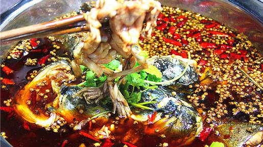 秘制的红油汤底,再加入上好的花鲢鱼头继续熬煮,待花鲢鱼头熬出鲜香味后,放入蛙。桌上标配的味碟,里面主要有大头菜、花生碎和葱花。先吃鱼头,再吃蛙。鱼头爽滑,美蛙细嫩,先鱼后蛙形成从爽滑到细嫩的味觉层次,味道棒极了!