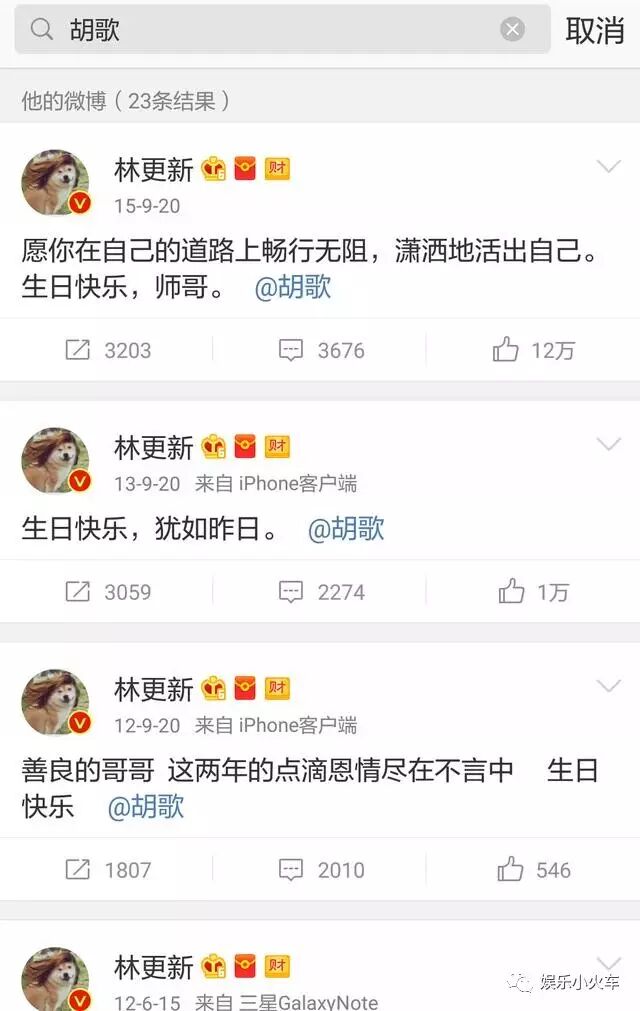 胡歌是林更新师兄,每年林都会发微博送生日祝福,叭姐搜了一下林的微博,胡歌占比还挺高!