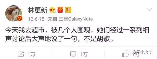 事情源于12年林更新的一博:今天去超市被几个人围观,经过仔细讨论后大声说了一句,不是胡歌。然后两人的缘分就展开了!