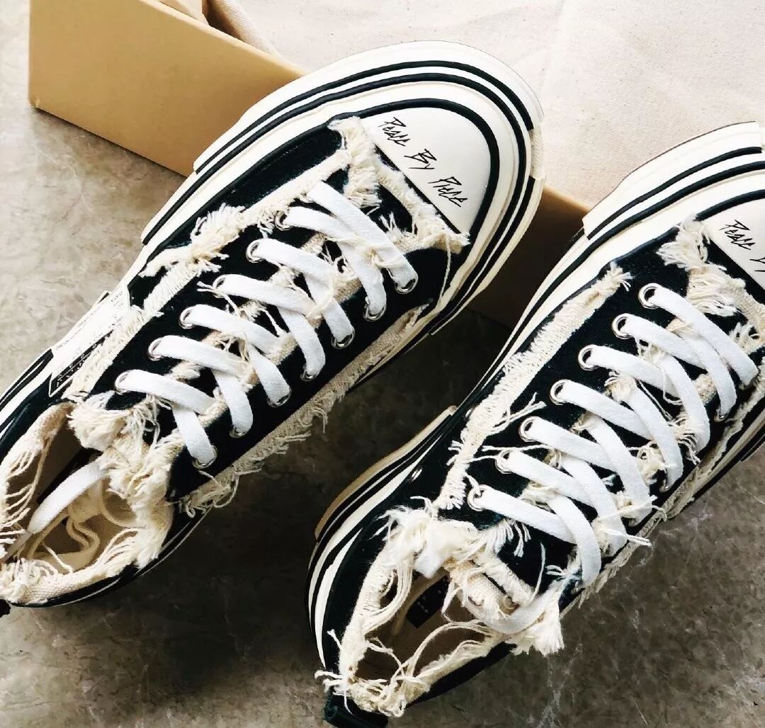 好好说好好说,这双帆布鞋其实是将好几双帆布鞋解构再重组,表面帆布的抽须及破坏和多层次的大底都表现了这双鞋的不平凡。