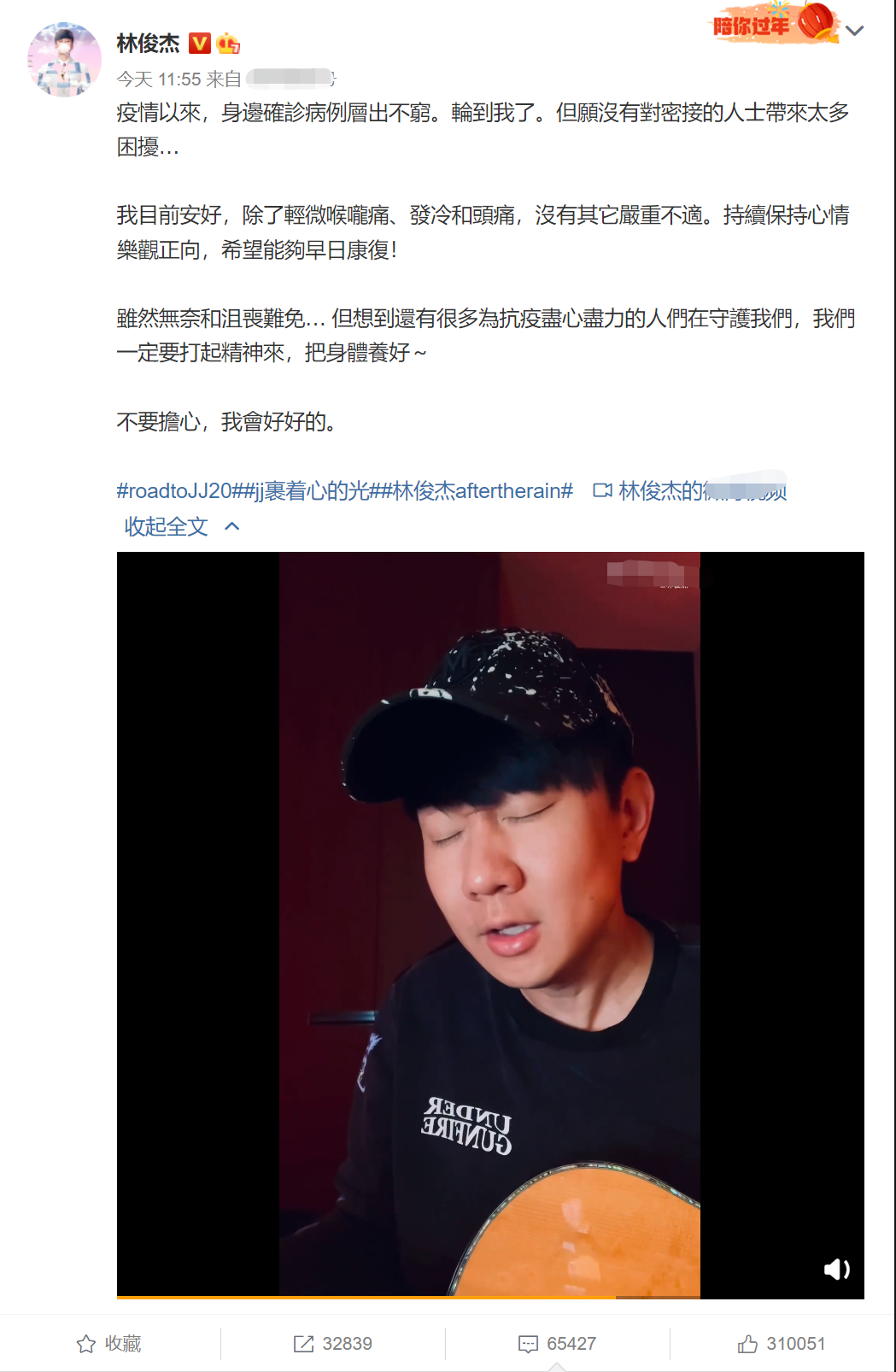 4月8日中午,林俊杰通过社交平台发文透露自己确诊新冠。