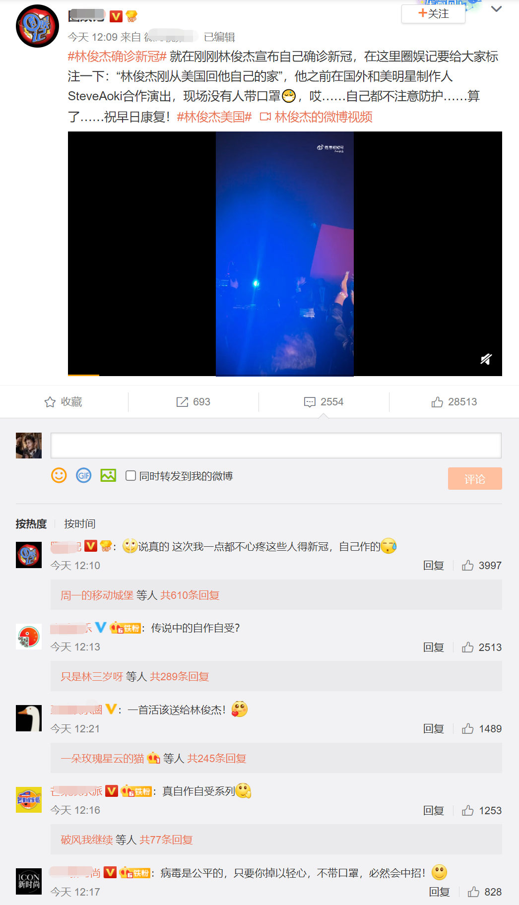 林俊杰宣布自己感染新冠后,很快“林俊杰美国”的话题就冲上热搜,同时网络上出现了不少批评和嘲讽的声音。