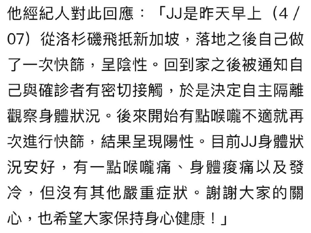 而林俊杰的经纪公司也向媒体透露,林俊杰4月7日从洛杉矶飞抵新加坡,他在上飞机之前做了检测是阴性,抵达新加坡落地之后又做了一次检测,依然是隐阴性,到家之后才被通知自己与确诊者有过密切接触,于是自主隔离,出现喉咙不适的症状时再次检测结果呈阳性。