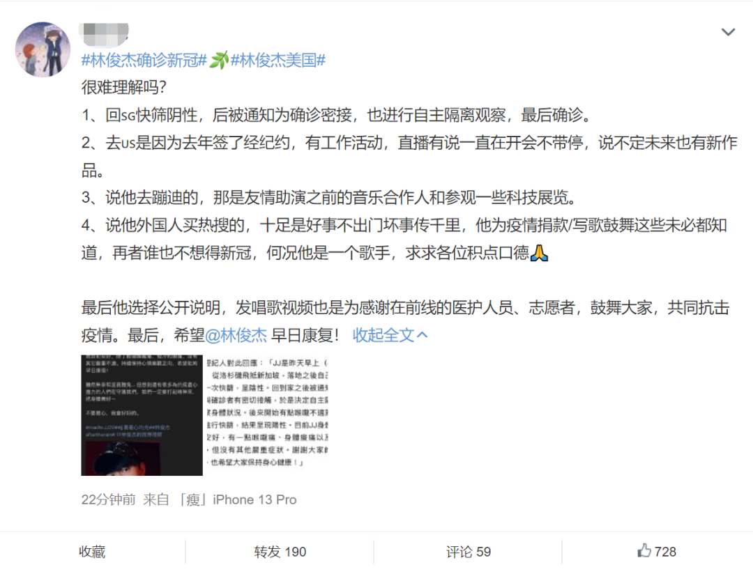 平心而论,没有任何人想感染新冠,谁不想健康地活着呢?明星也一样,他们并不是新冠的原罪,因此,绝大多数宣布确诊新冠的明星都得到了网友的关怀和祝福,但到了林俊杰这里情况变了。