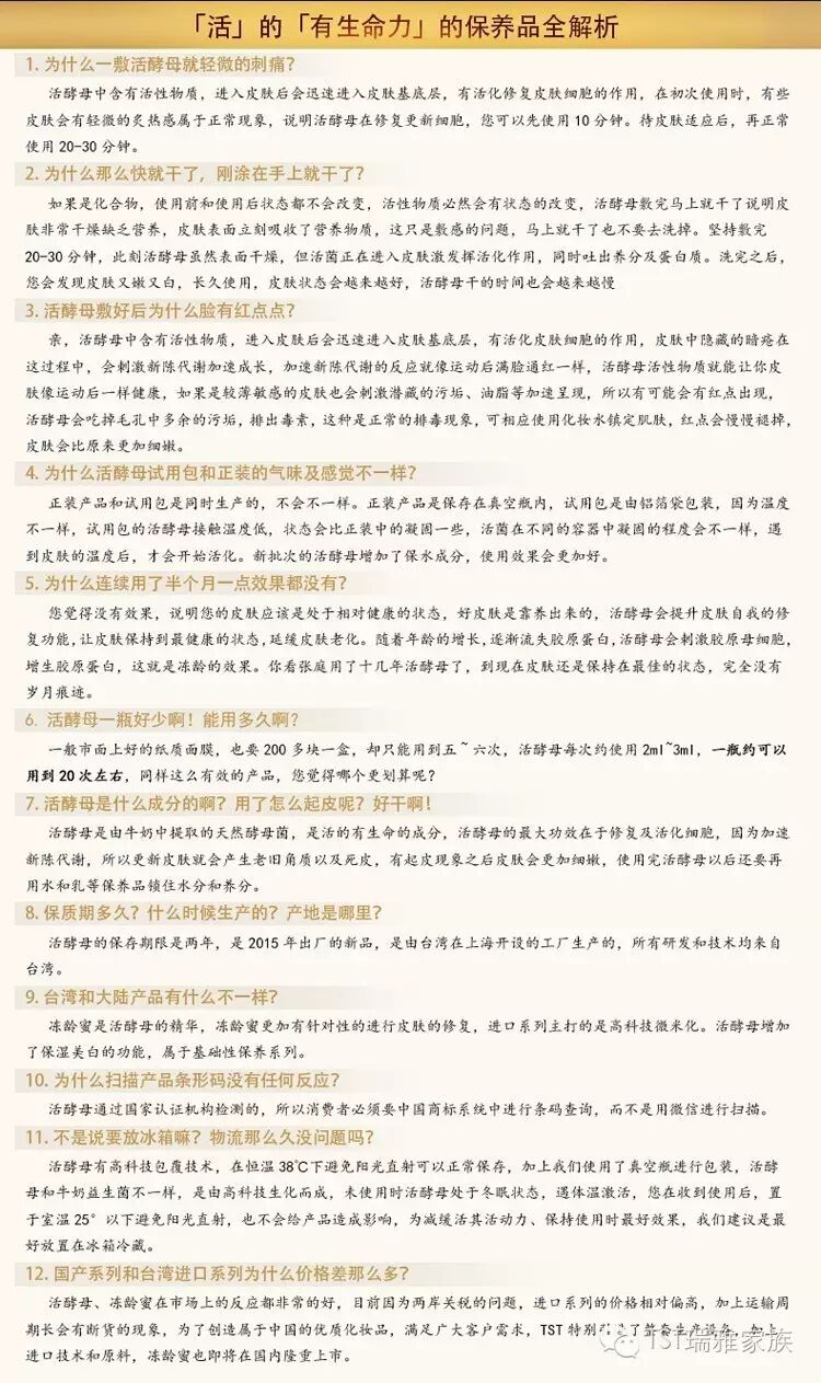 A:三菌合一的活酵母,有时因温度变化,若有浓稠改变不会影响到活酵母的活动力与效果性。再者每批次的活酵母出厂的检验是十分严格的。因秋冬季节来临,有增加乳酸杆菌/北美圣草的比例,增加保湿能力。请放心使用。遇到些问题,大家会以为是TST活酵母不适合自己,甚至有些人会以为TST活酵母有问题,但这只不过是活酵母这种菌的特性而已帮你维护最好的肌肤状况。有人会说含酒精,其实这是活酵母发酵过程中产生的酒精,并非人为添加。