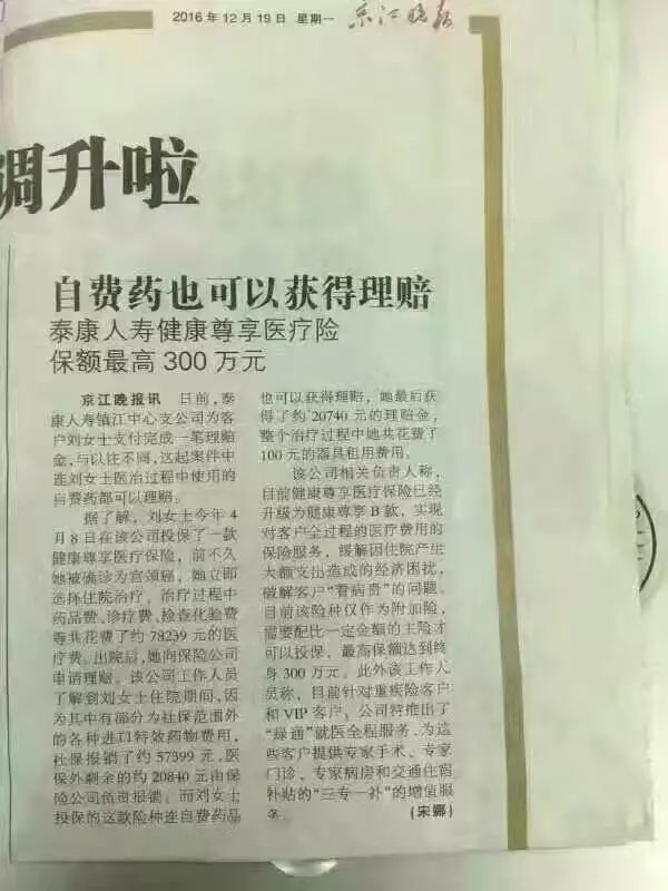 京江晚报讯:日期,泰康人寿镇江中心支公司为客户刘女士支付完成一笔理赔金,与以往不同,这起案件中连刘女士医治过程中使用的自费药都可以理赔。