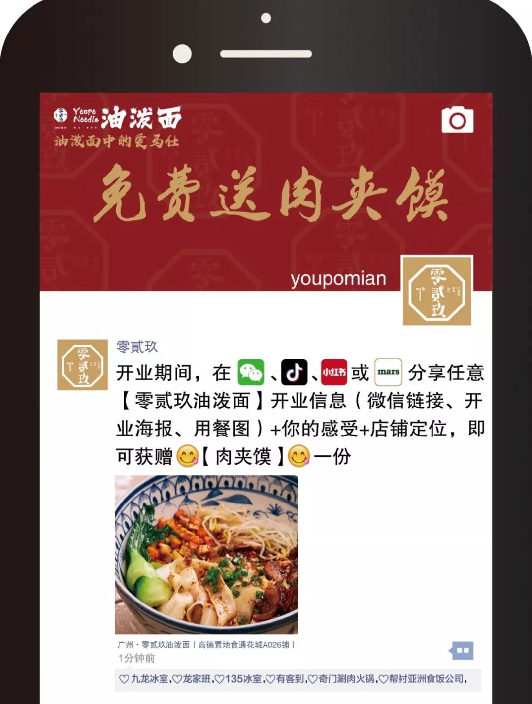 按要求参与活动可获得招牌肉夹馍一份。