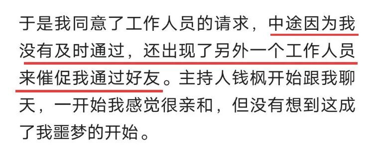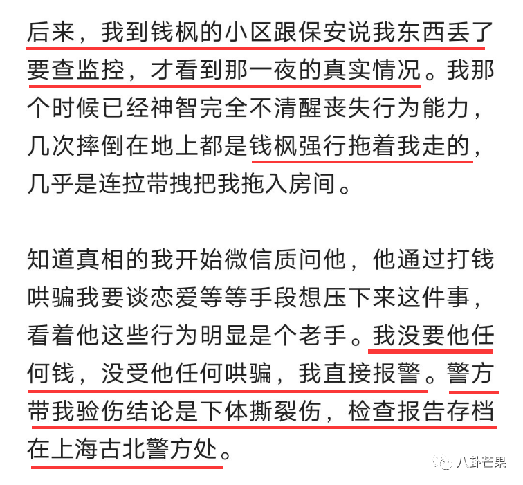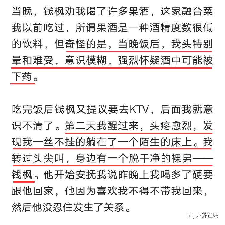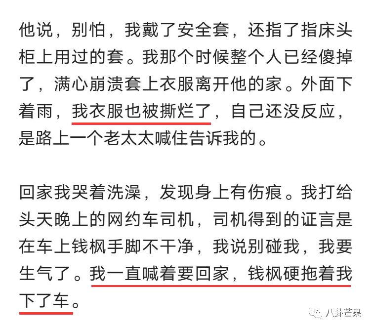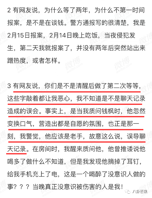 关于“是不是清醒后做了第二次”,她说是钱枫在故意误导聊天氛围,也就是那一刻,她觉得他是老手。