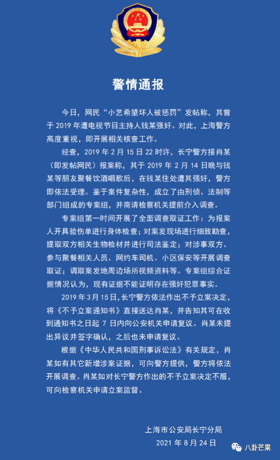 当天晚上,上海市公安局长宁分局就出了“警情通报”。速度很快。当时的调查结论是【现有证据不能证明强奸犯罪事实】。