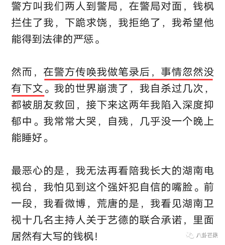 小艺在警局做了笔录之后,说“事情忽然没有下文”。没有立案。前段时间,她看见湖南卫视主持人的“艺德联合承诺”,里面有大写的钱枫,更受刺激。