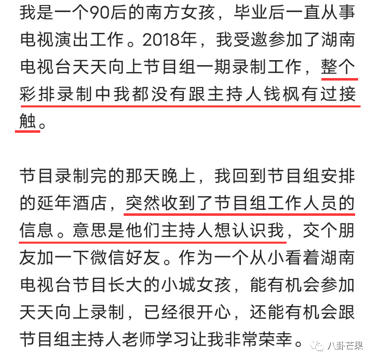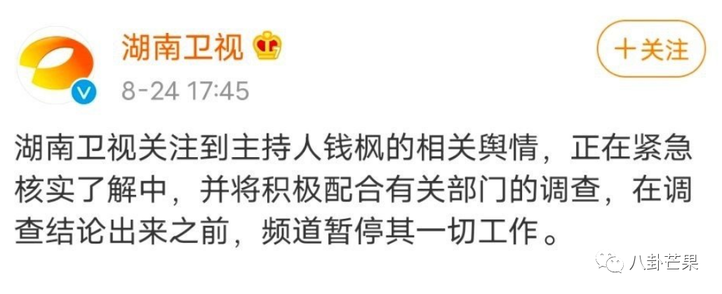 爆料的当天下午,湖南卫视暂停了钱枫的工作。