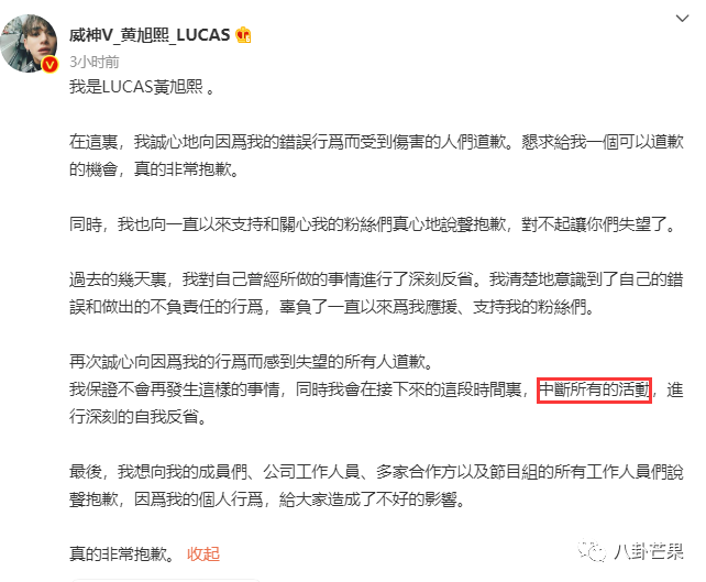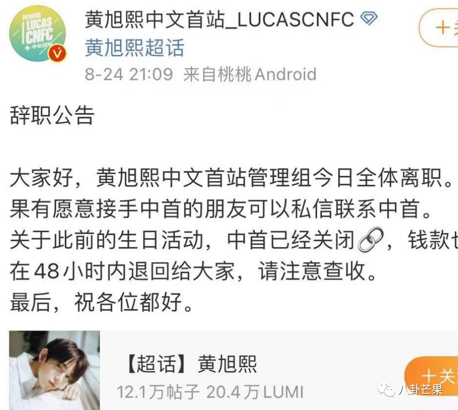 这两天,有一个叫黄旭熙的爱豆被几个女性出来控诉他【私聊粉丝、劈腿、冷暴力】等等,他的站子“全体辞职”。但没多大水花。一是因为他比较糊,二是因为现在大众已经对这种事没多大反应了。