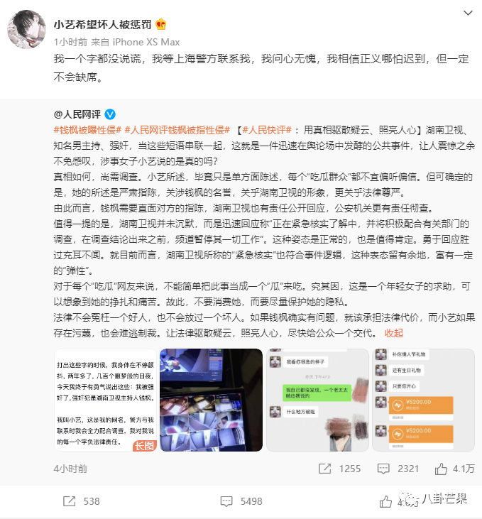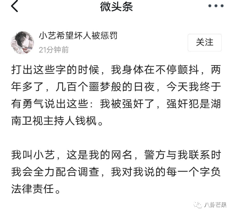 昨天,一位网名叫“小艺希望坏人被惩罚”的网友,发文控诉钱枫强奸,小艺:“我对我说的每一个字负法律责任。”