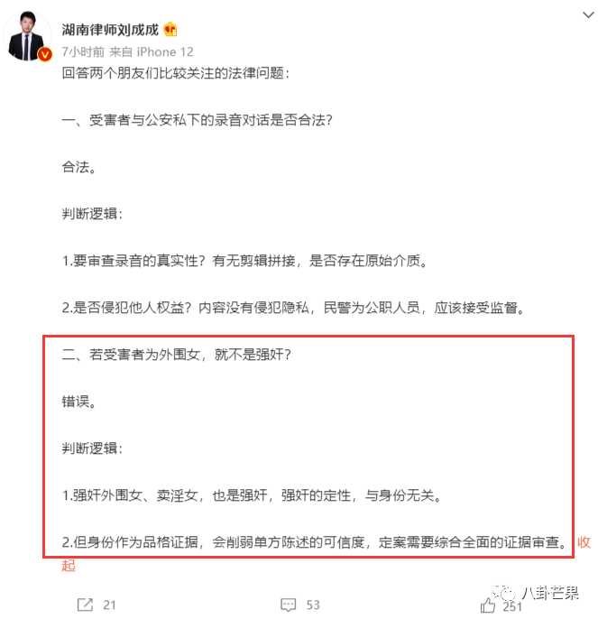 另外,有人问:“若受害者是外围女,就不是强奸?” 律师:【错误。强奸的定性,与身份无关。】