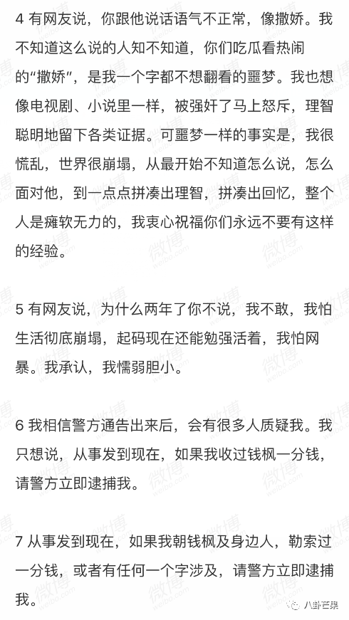 她再次解释自己这两年的沉默,以及【绝没收过一分钱,也绝没问钱枫拿过钱】,如果有,请警方立即逮捕她。
