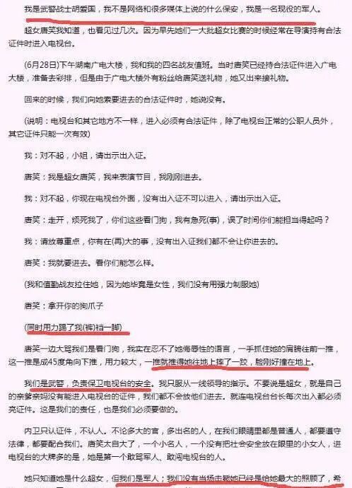事情并没有就此停止,随后有一个自称是打唐笑的武警本人在网上发文公布事情“真相”,文中称唐笑在被拒绝进入电视台后谩骂武警,说他是看门狗,态度十分蛮横。文章不仅还原了争执的过程,还说自己根本没有打唐笑,是唐笑自己不小心摔倒然后脸磕在了地上才受伤的。文章里严肃地写道:我们没有当场击毙她,已经是给她最大的照顾了,希望她能学会尊重人,遵守法律。