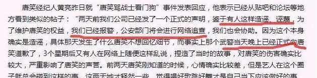 文章发出的第二天,唐笑也随机发文解释她和武警的矛盾已经化开了,双方达成了和解,希望观众不要再过多关注此事,同时这篇文章非武警本人撰写,她也采取了法律手段来维护自己的权益。