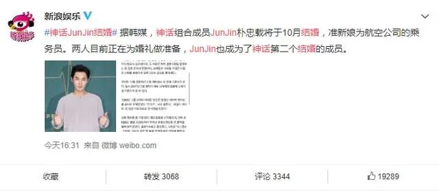 5月14日,据韩国媒体爆料,韩国男团神话组合成员JunJin,将于今年10月举行婚礼。据悉,准新娘是一名航空公司乘务员,两人已经交往多年,并决定于今年10月举行婚礼,目前两位新人正在筹办婚礼。