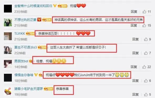 现在JunJin马上步入婚姻殿堂,粉丝们在送上祝福的同时,纷纷催婚,希望其他几位小哥哥,能够尽快找到自己的幸福,最后再次恭喜JunJin。
