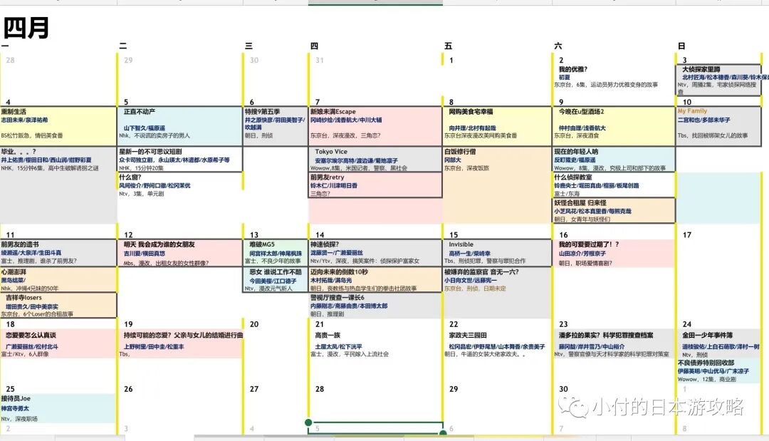 日剧日历(粗框的是有熟肉的。颜色分类:粉红是爱情类,蓝色是职场搞奋斗事业型(医疗啊,教师都放进去了),黄色美食,灰色案件刑侦恐怖悬疑,橘色是生活日常人际交往类。没确定的就没标色。如果背景不够,可能还会加字体颜色。之前一篇21秋季日剧10:相叶雅纪/佐佐木藏之介《和田家的男人们》和分类排名的开头有比较详细讲过怎么找熟肉看了,大家可以去看,我不重新贴了,还是懒或者找不到的,可以来问我。要给我点在看嗷!大部分跟“豆瓣”复核过,或者是字幕组的剧名。有的找不到中文是直接搬的日文/英文。然后,朝日台的官网我这里没办法看日剧的内容,所以未出的新剧可能没有他家的。
